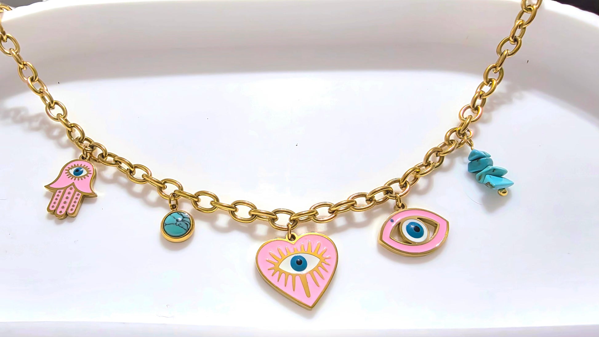 Charms: pink enamel evil eye, Hamsa hand, turquoise stones