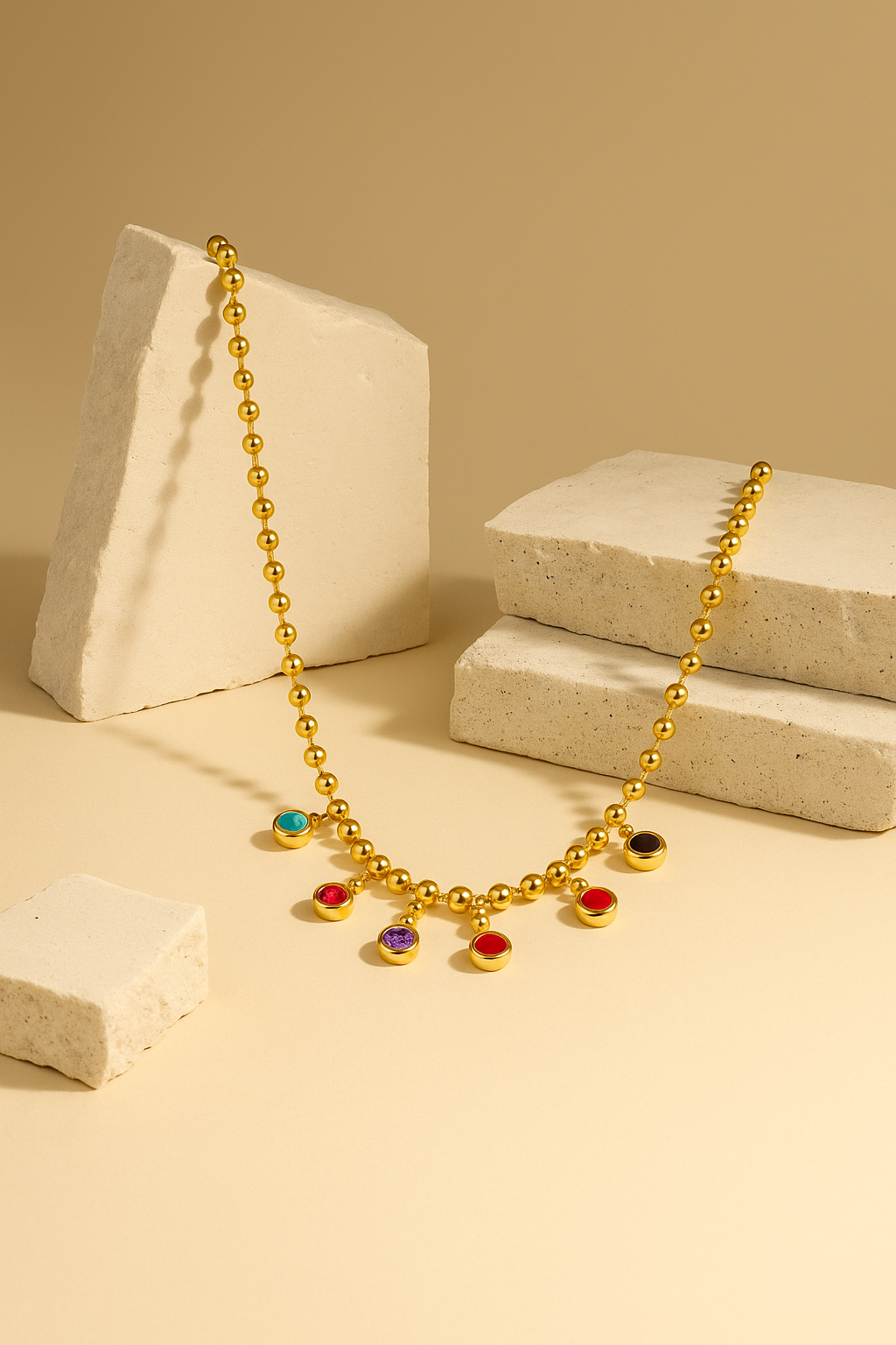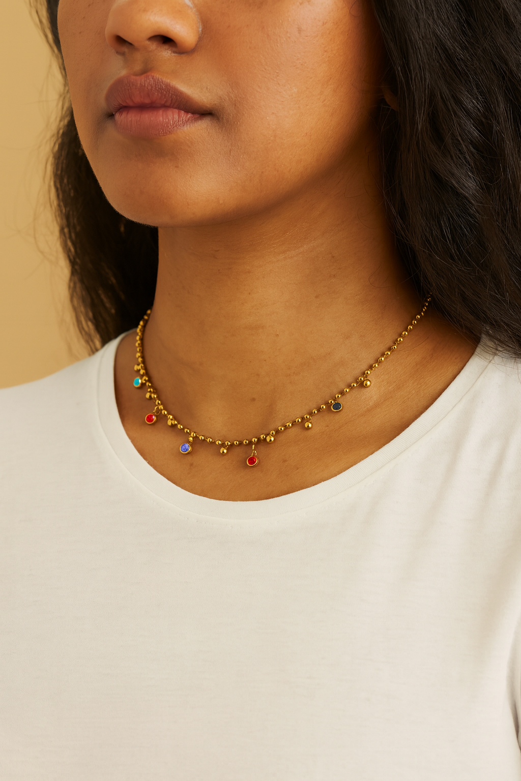 Add a pop of color and elegance to your style with this gold beaded necklace, featuring vibrant gemstone charms in shades of red, blue, black, purple, and more. Each charm is bezel-set on a delicate chain of polished gold beads, creating a chic yet playful look. Perfect for layering or wearing solo, this piece transitions seamlessly from everyday wear to special occasions.