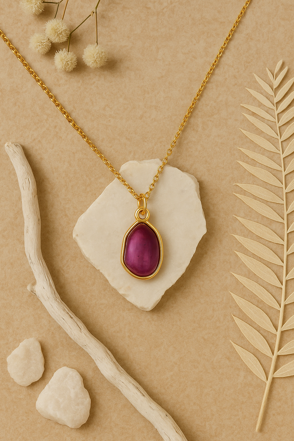 Make a timeless statement with this purple gemstone pendant necklace, set in a sleek gold bezel on a delicate chain. The teardrop-shaped stone adds a touch of elegance and charm, making it perfect for both everyday wear and special occasions. Its minimalist yet bold design makes it a versatile accessory to layer or wear solo.