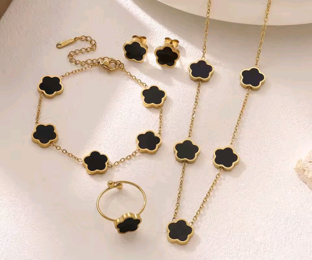 Gold-Plated Clover Jewelry Combo Set – Black & White Variants (Necklace, Bracelet, Earrings, Ring)