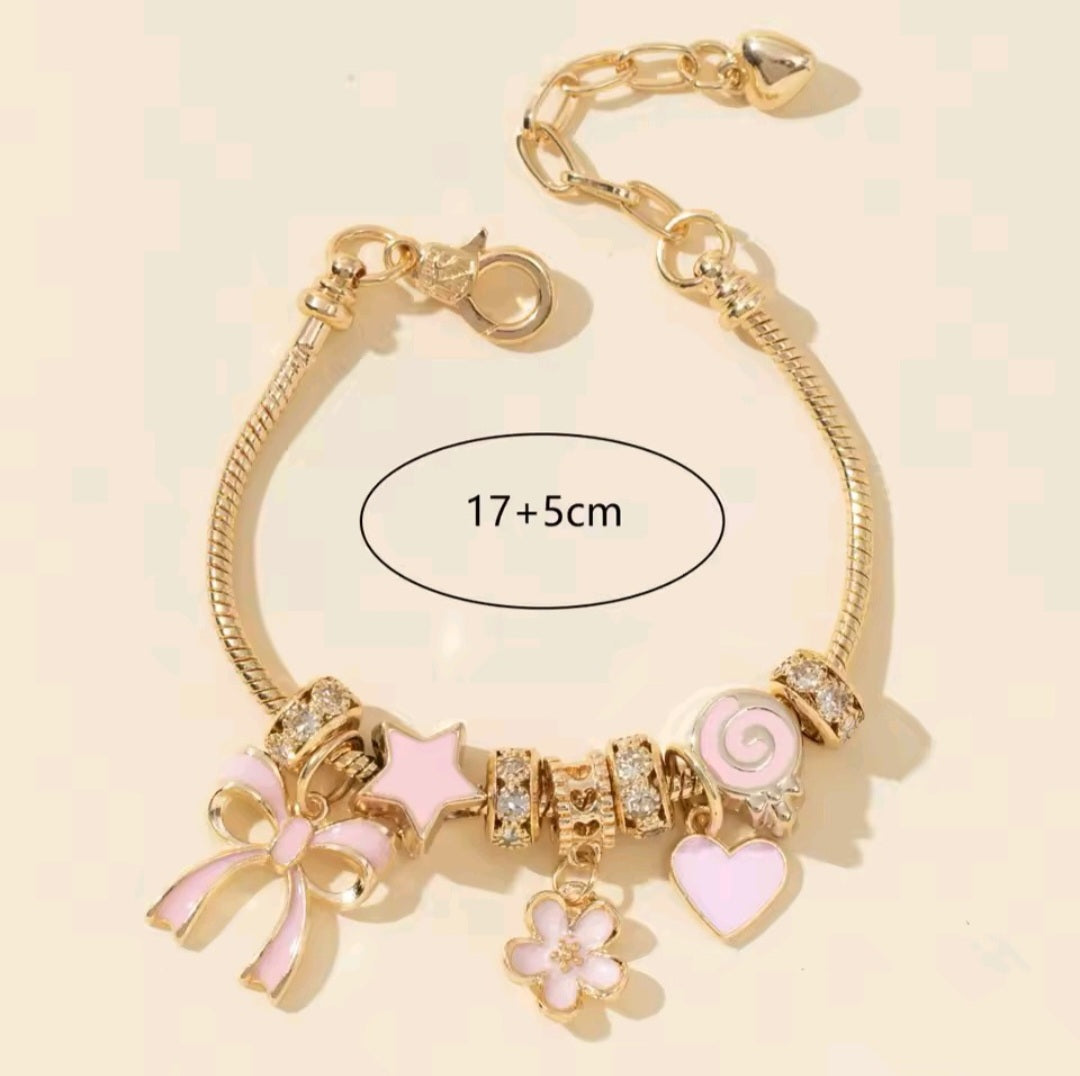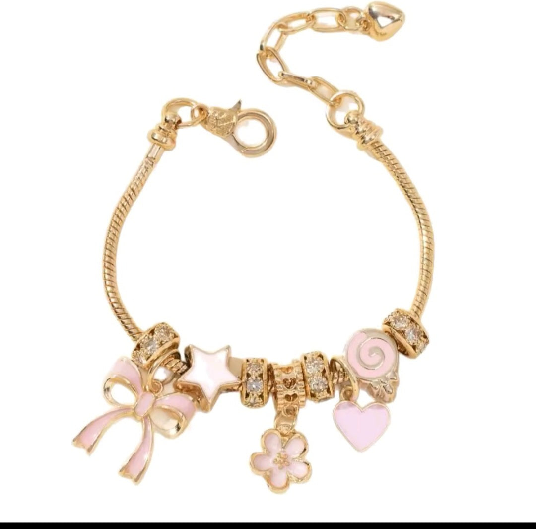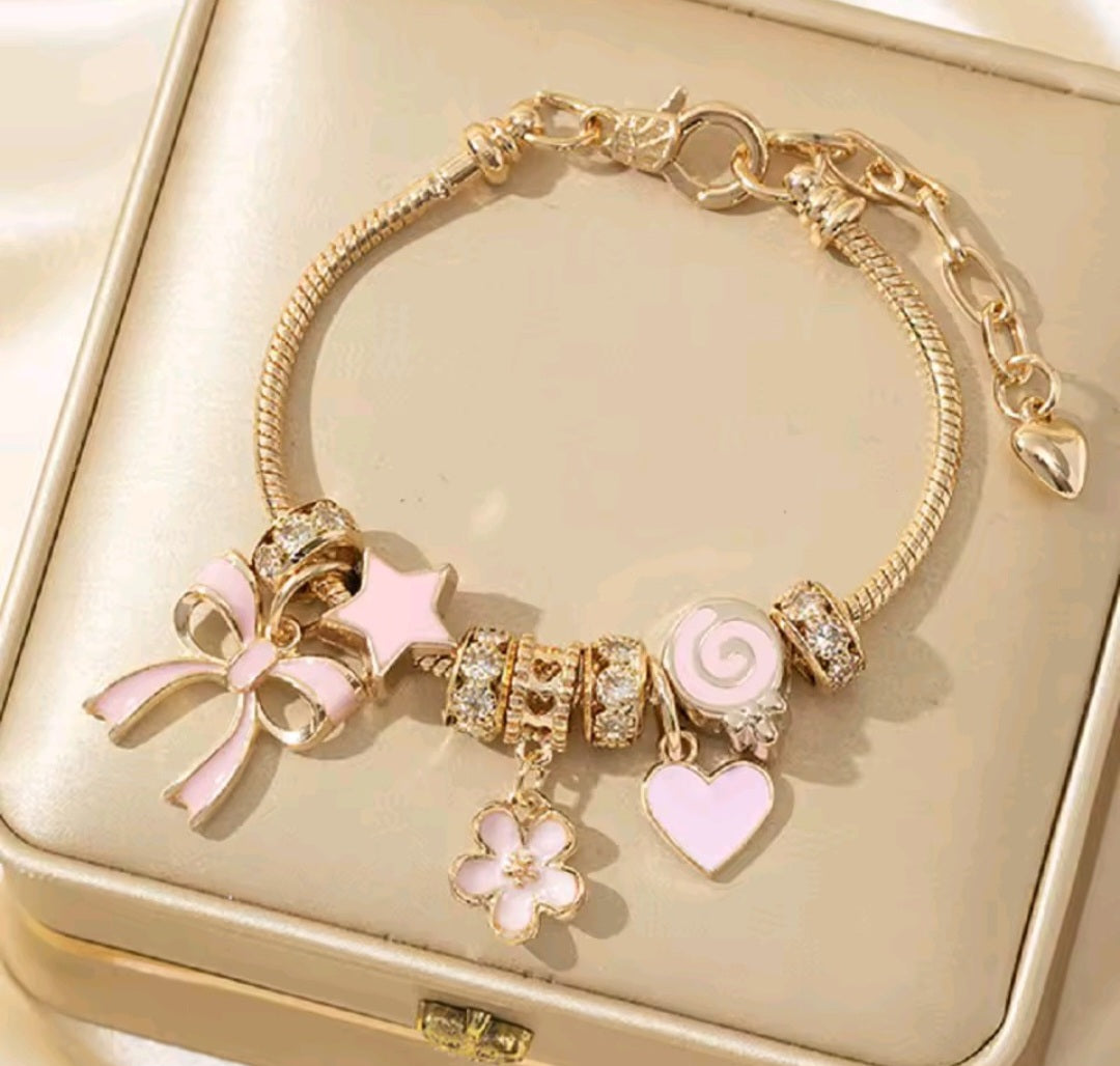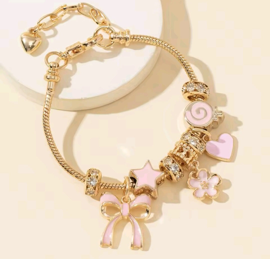 Sweet, chic, and playful — this charm bracelet is a perfect blend of elegance and fun. Crafted with a gold-plated snake chain, it features sparkling rhinestone spacers and pastel pink enamel charms including a bow, star, flower, swirl, and heart. The adjustable clasp ensures a comfortable fit, making it a versatile accessory for everyday wear or special occasions.