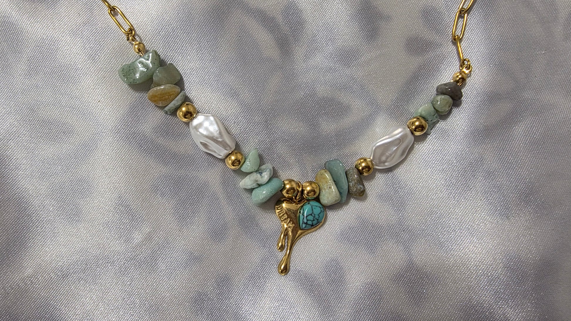Materials: Natural green gemstones, baroque pearls, gold-plated beads, alloy chain