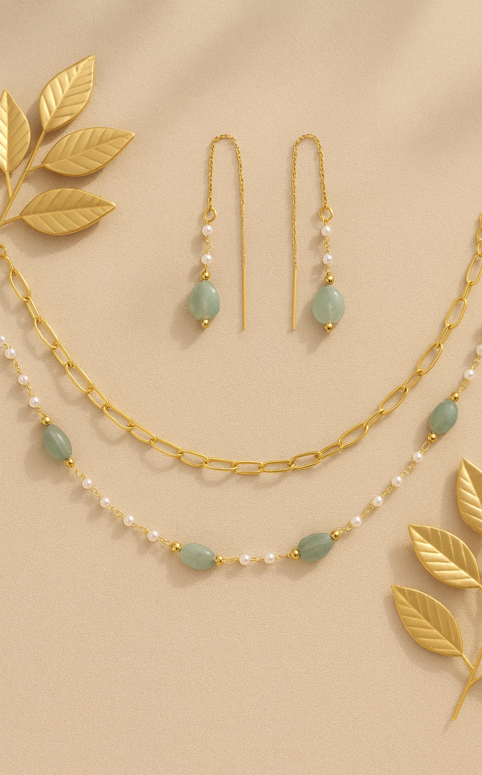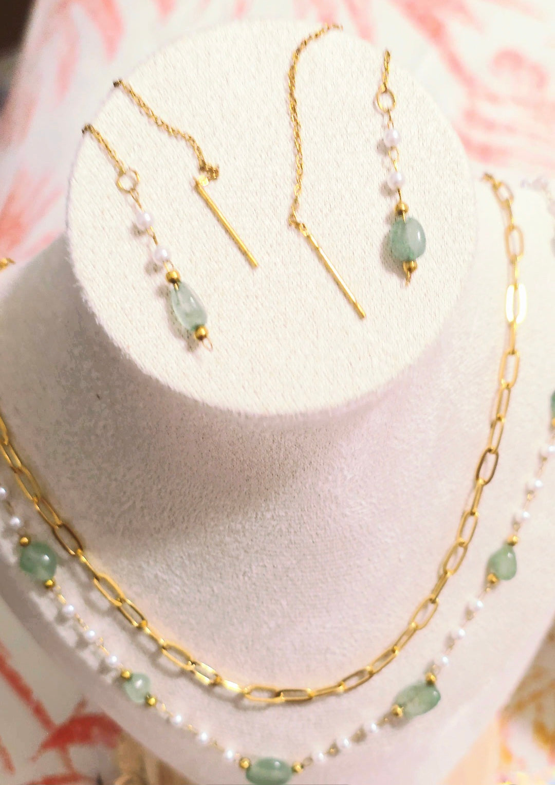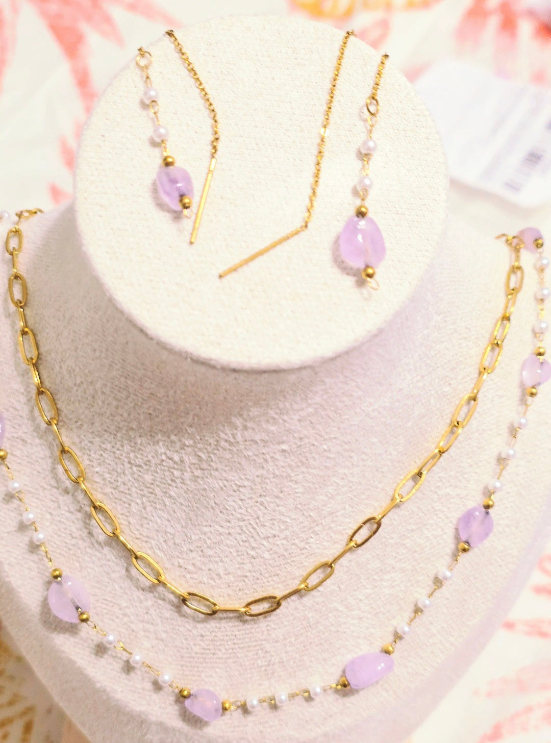 Layered Gemstone Necklace & Earrings Set – Gold Chain with Pearls (Lavender & Green)