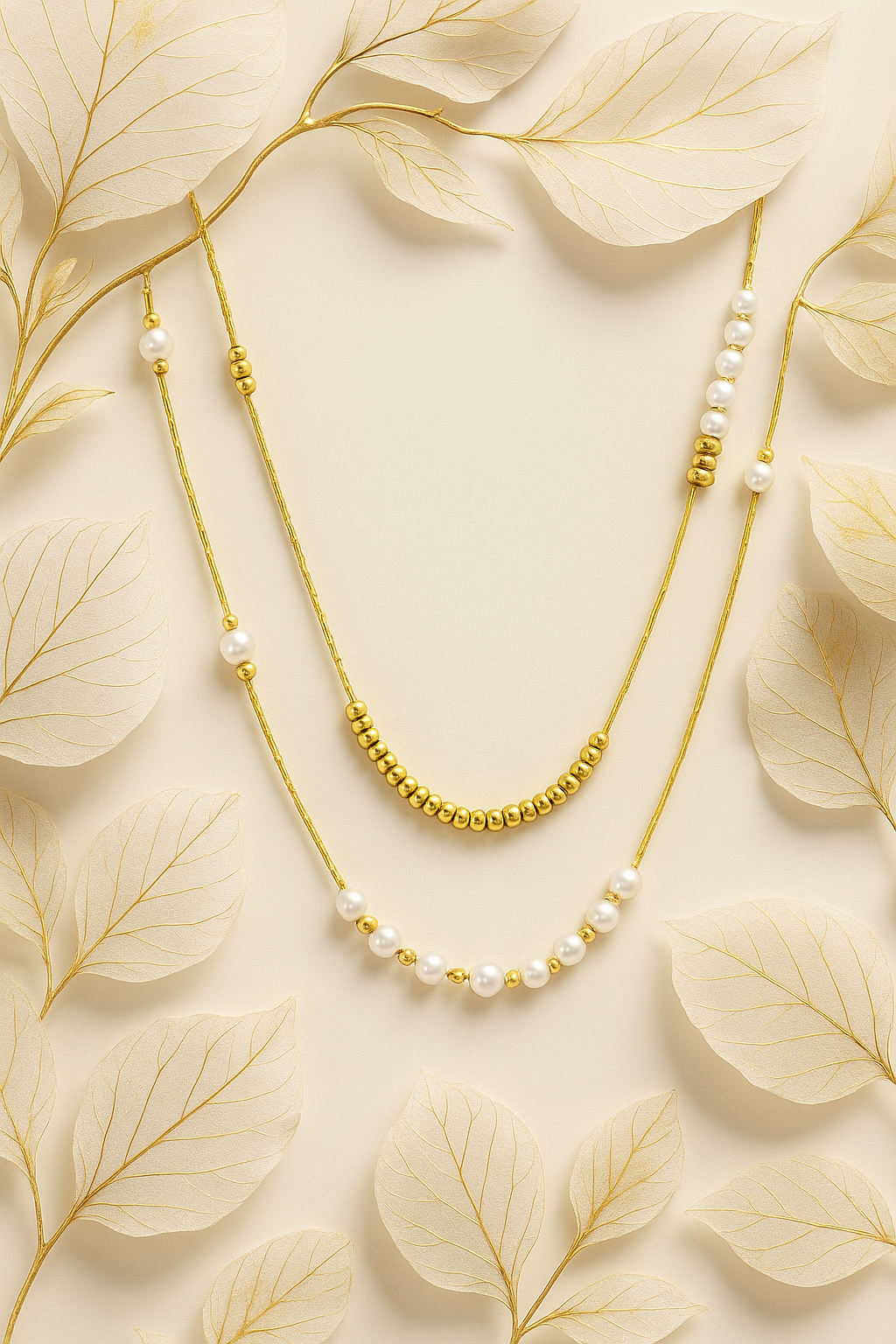 Add timeless elegance to your collection with this layered gold and pearl necklace. Featuring two delicate chains, accented with lustrous pearls and golden beads, this piece is perfect for both everyday wear and special occasions.