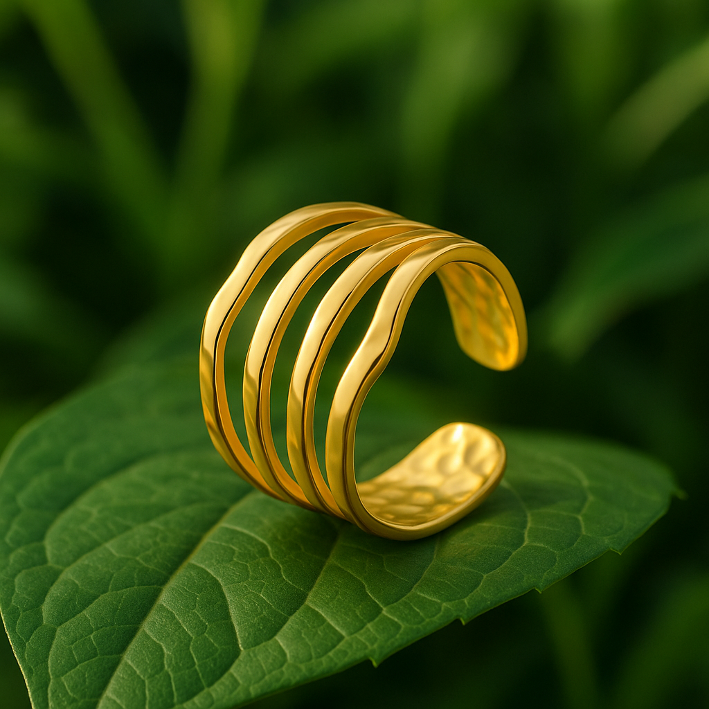 Elevate your look with this modern wavy gold cuff ring, designed with layered open bands that create a bold yet elegant silhouette. The hammered detail adds a touch of artistry, while its adjustable fit ensures comfort and versatility.